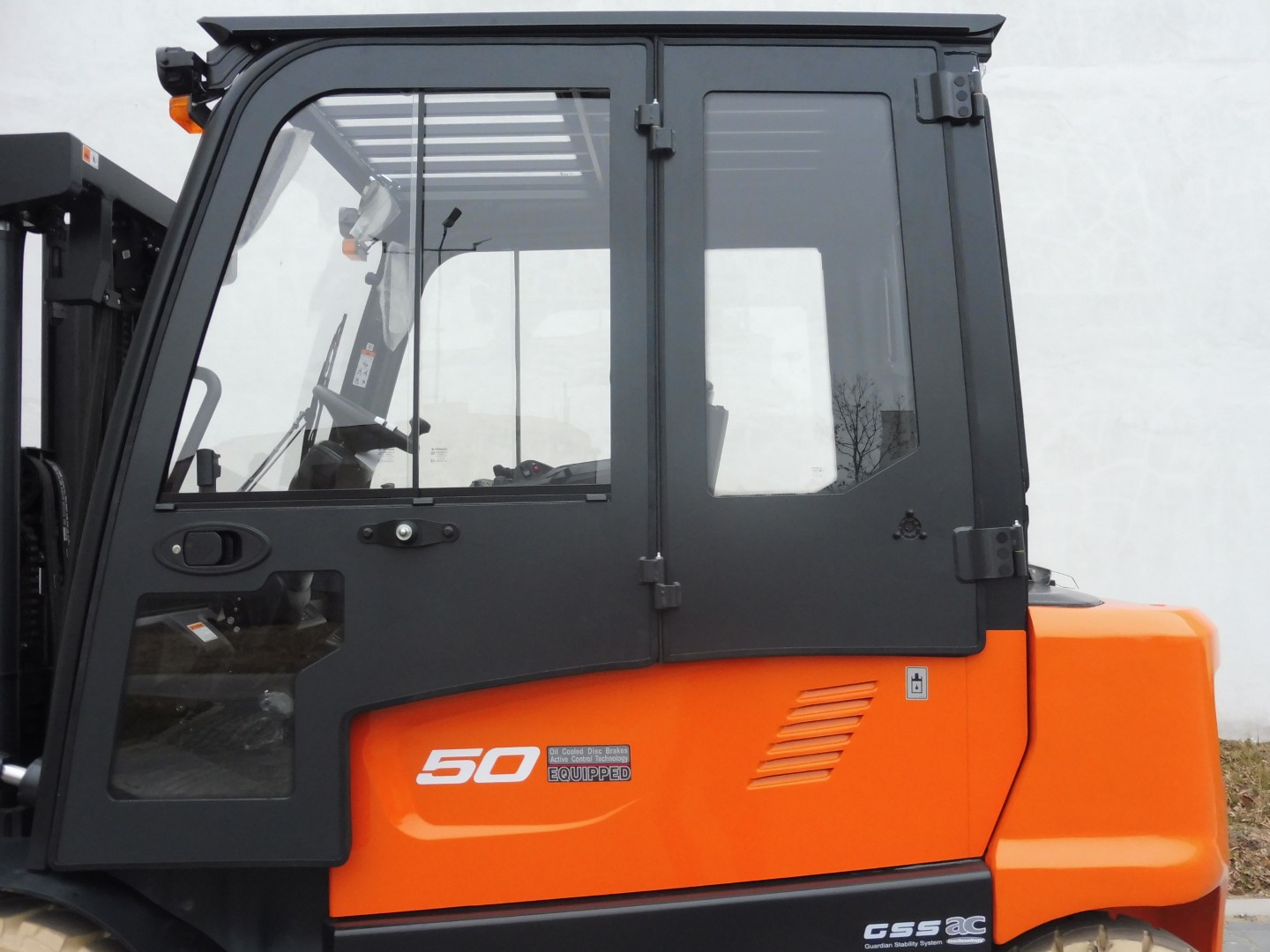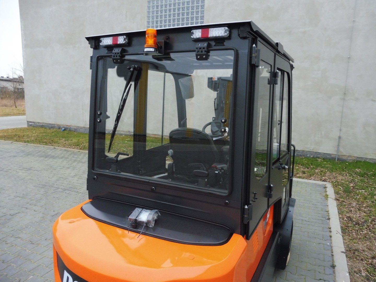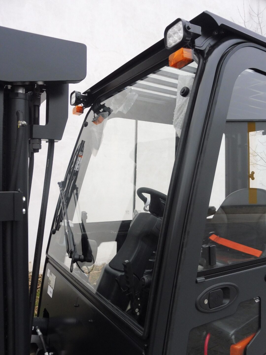 The cab for this forklift model is a modern solution combining lightweight construction with a large area of glazing, guaranteeing excellent visibility and working comfort in all weather conditions. With its ergonomic design, durable materials and careful workmanship, the cab ensures not only safety but also comfort in any environment, even the most demanding.