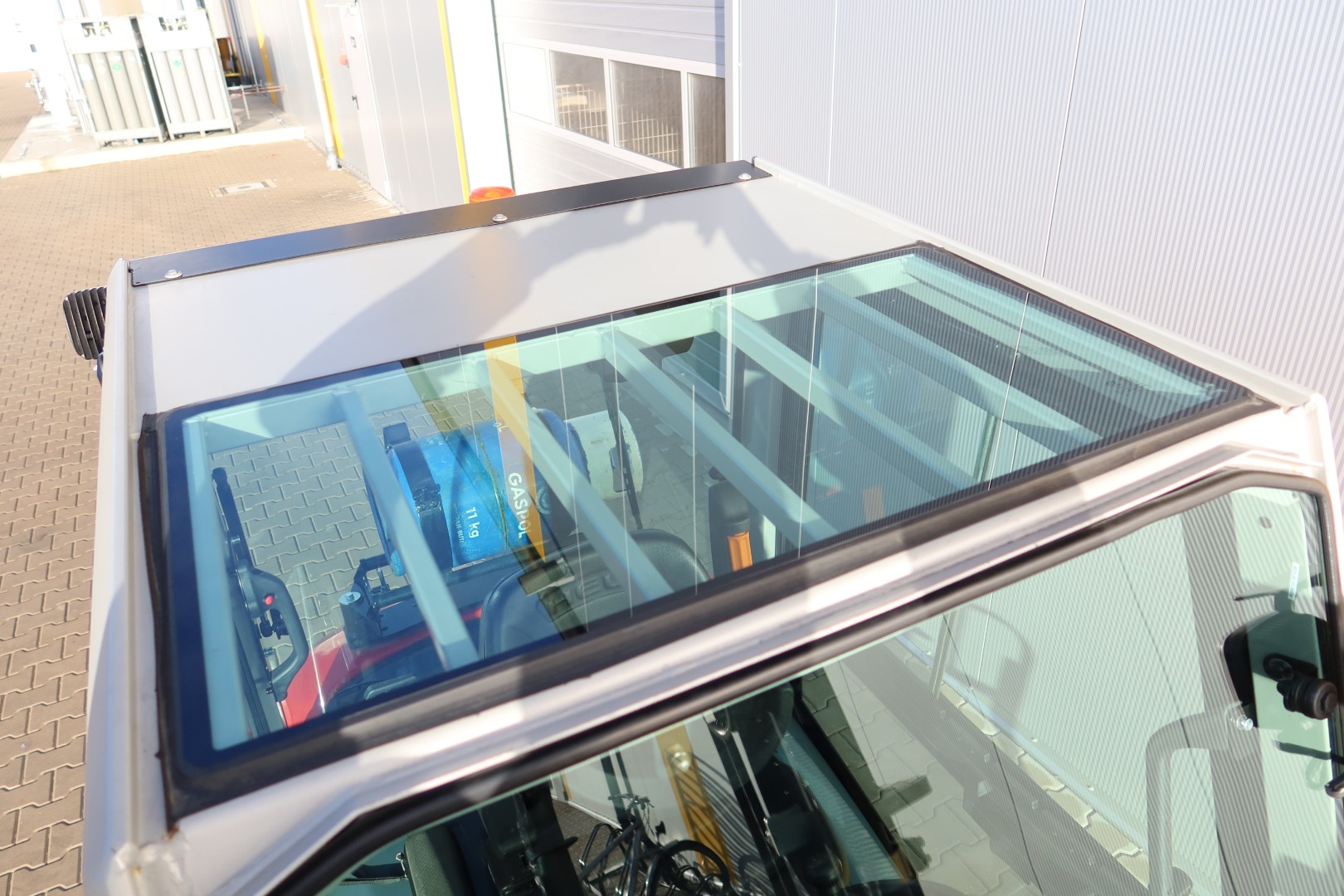 The cab's roof glass is made of toughened glass coated with safety film, which provides maximum protection for the operator, as it does not shatter into small fragments in the event of damage, but retains its shape and therefore minimises the risk of injury to the operator.